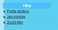 Usnadnění hledání podle filtrů Pro snadnější vyhledávání jsou určeny filtry. Hledáte-li například stereofonní videorekordér SONY, opakujte postup hledávání ve stromové struktuře, pro snadnější vyhledání vámi požadované značky však stiskněte filtr Podle výrobce. Dostanete na výběr ze seznamu všech značek, které máte u wattíka k dispozici.Pokud například navštěvujete náš internetový obchod častěji a chcete najít novinky, které byly v poslední době přidány do katalogu zbží, použijte filtr Jen novinky. !POZOR! Pro další vyhledávání zboží v katalogu je však vámi zadaný filtr stále aktivovaný a zobrazuje zboží podléhající jen parametrům filtru. Chcete-li filtr odblokovat, nezapomeňte Zrušit filtry!!! |
